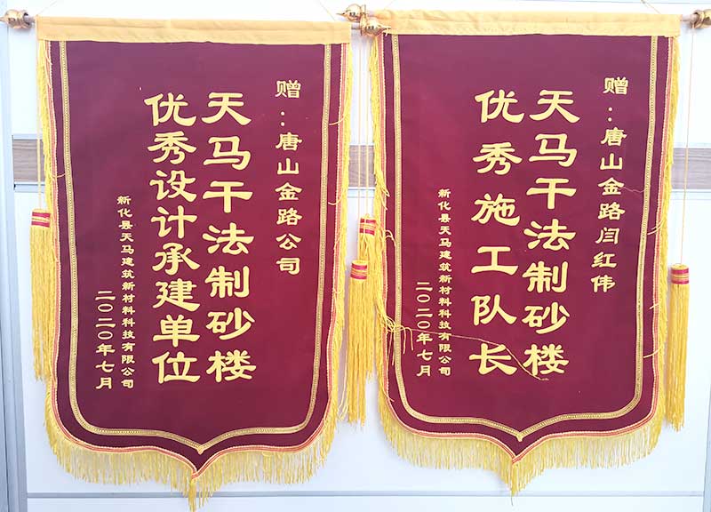 近日,天馬建筑項(xiàng)目負(fù)責(zé)人將兩面印有“天馬干法制砂樓,優(yōu)秀設(shè)計承建單位”、“天馬干法制砂樓,優(yōu)秀施工隊長”的錦旗送到了唐山金路安裝隊長閆紅偉的手上。